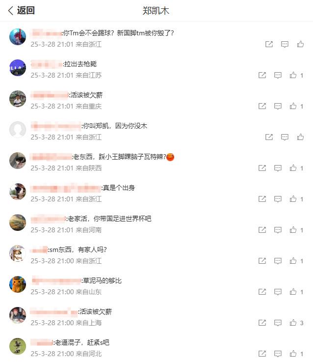 在这样的情况下郑凯木的个人微博便成为了球迷泄愤的场所,他在1月3日发布的一条评论区已经遭到了大量的辱骂。
